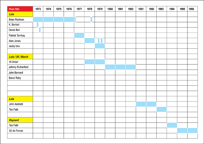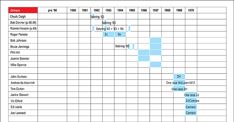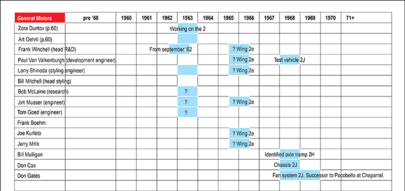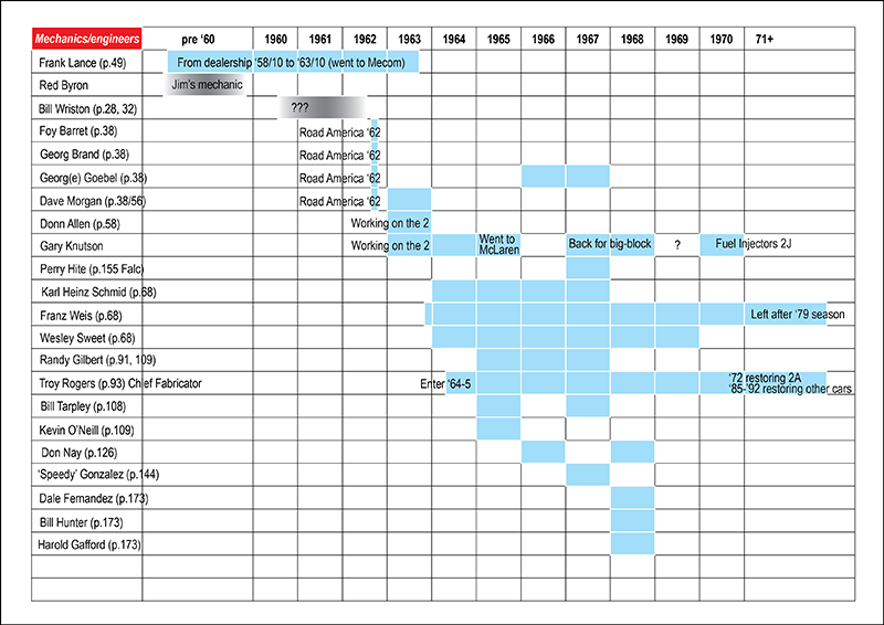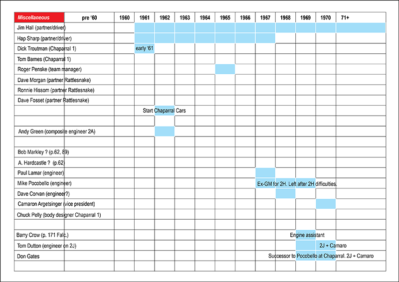 It's a compilation from different sources but he book Chaparral Can-Am & Prototype Race Cars by Dave Friedman was extra helpful because this book is a stunning photographic record with many people portrayed and appointed.