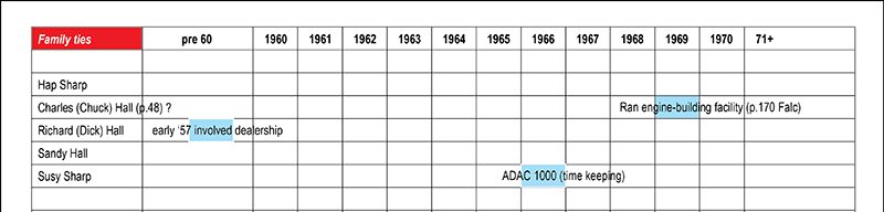 I have divided the people into subgroups (red markings). A p. with number between brackets refers to photos at pages in the book mentioned. An added Falc. refers to the book Chaparral by Richard Falconer and Doug Nye.