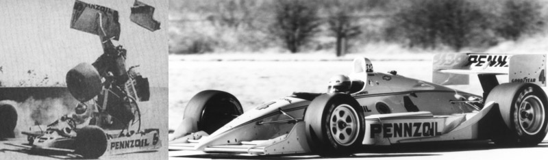 When, after a very successful racing career, the Chaparral 2K was finally found obsolete at Indianapolis in 1982, Hall bought a March 82C for Johnny Rutherford to finish the season. Johnny crashed heavily with the March at Pocono, breaking just a finger (left). He returned to the series two weeks later with a second March chassis, finishing 12th in the championship.