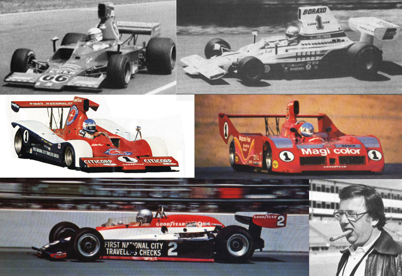 In 1974 Jim Hall was back on track. In partnership with US Lola importer Carl Haas (the character with the ever prominent cigar, (bottom right) he became an entrant in the North American Formula 5000 championships and the revival CanAm series later on in the Seventies. Because of excellent preparation and operational qualities they became highly successful. Formula 5000 Championship were won in '74, '75' and '76 with Brian Redman driving (top row).